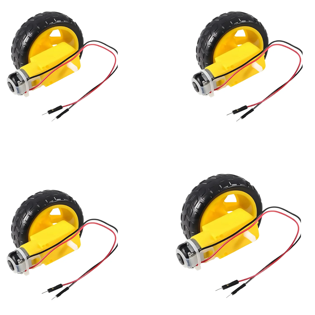 4 MOTOR DC 3-6V COM CAIXA DE REDUCAO E EIXO DUPLO + RODA 68MM + JUMPERS SOLDADOS